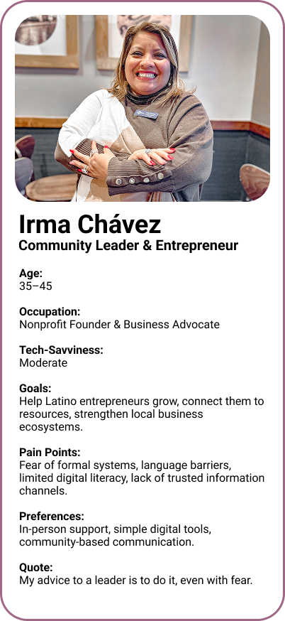 The resources exist. But they are written in English, designed for a general audience, and built on assumptions that don't reflect this community. During COVID-19, many Latina entrepreneurs didn't apply for free government relief money, not because they weren't eligible, but because the system felt like a trap. That is what inaccessible design costs in real life.