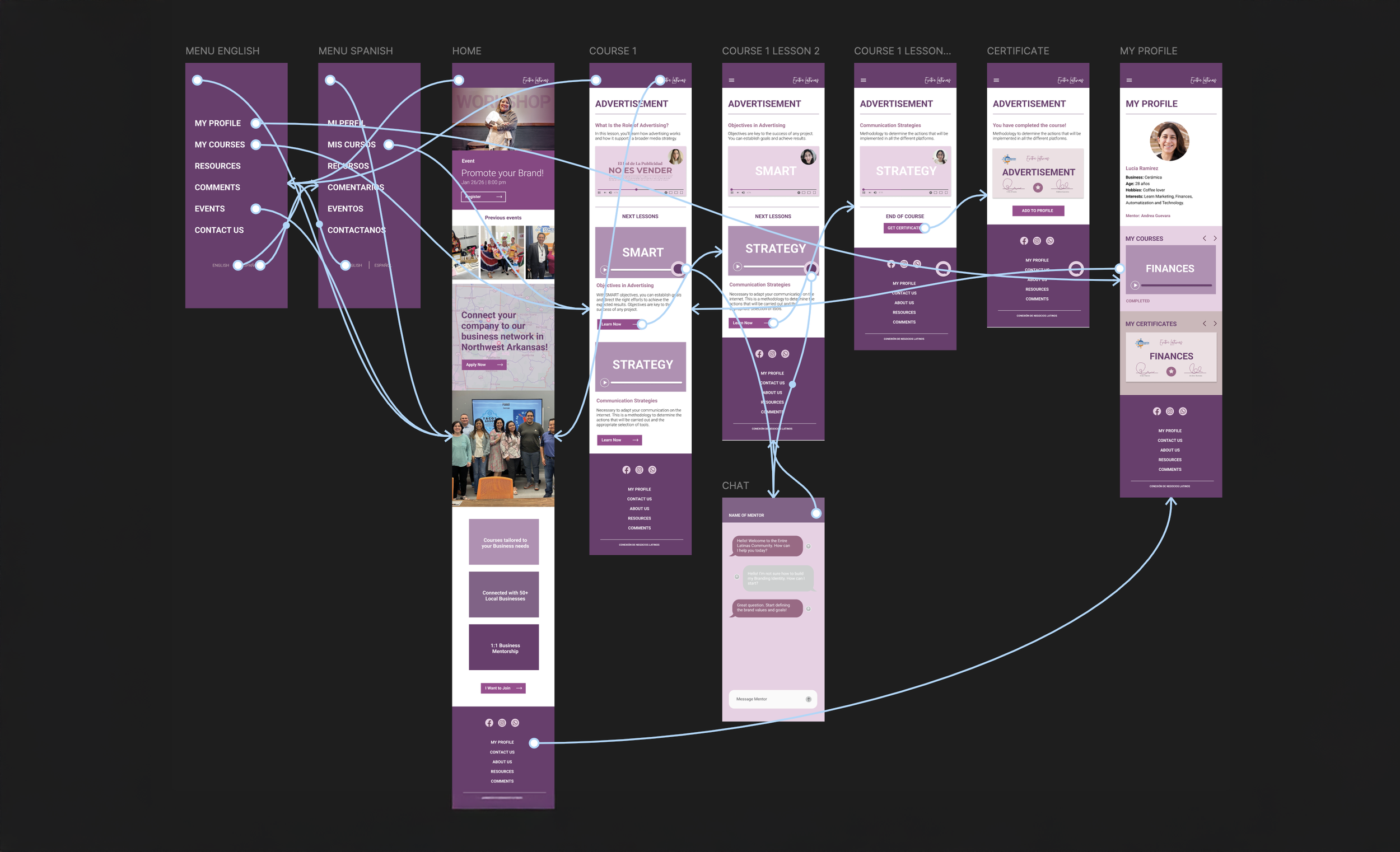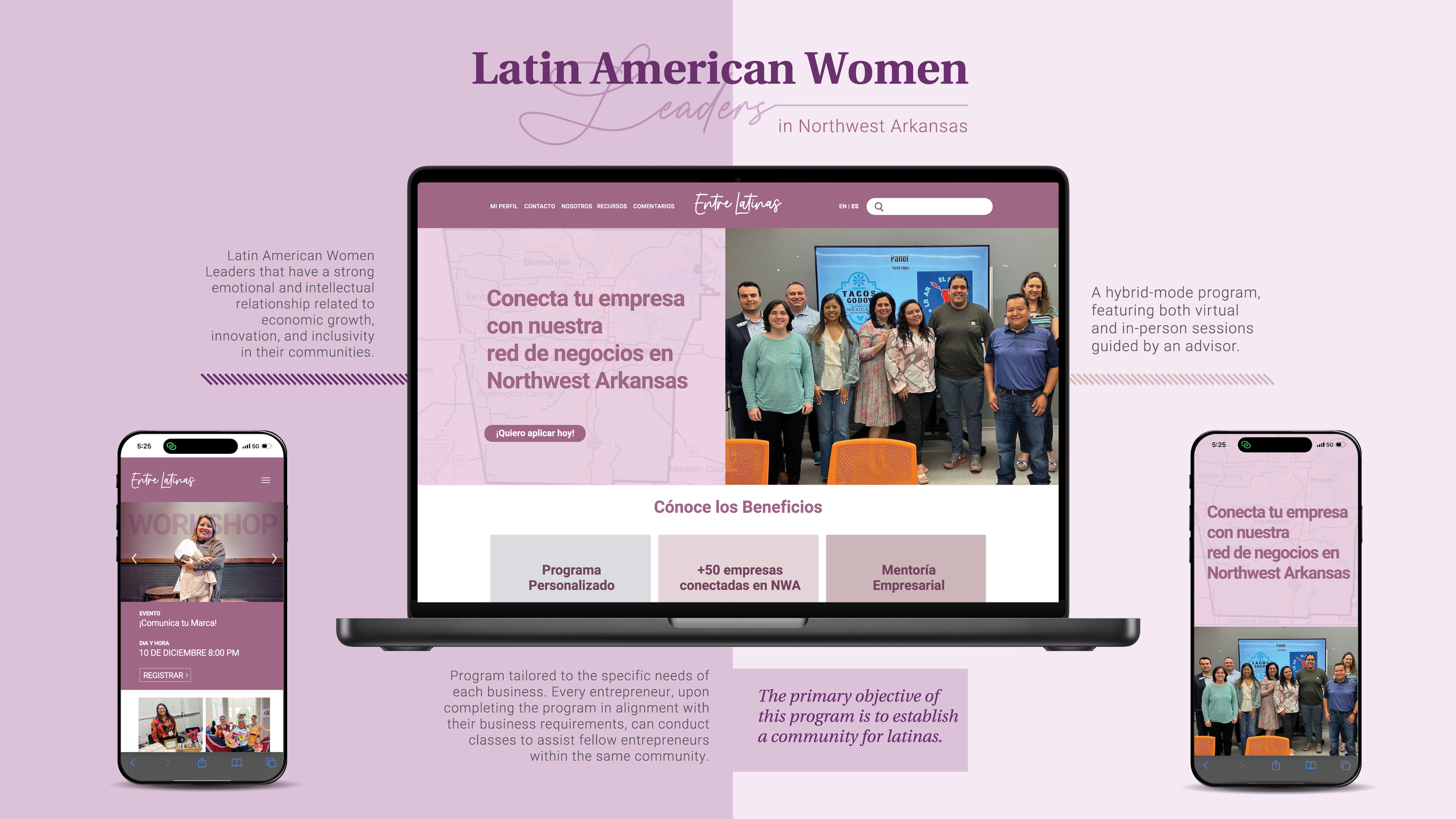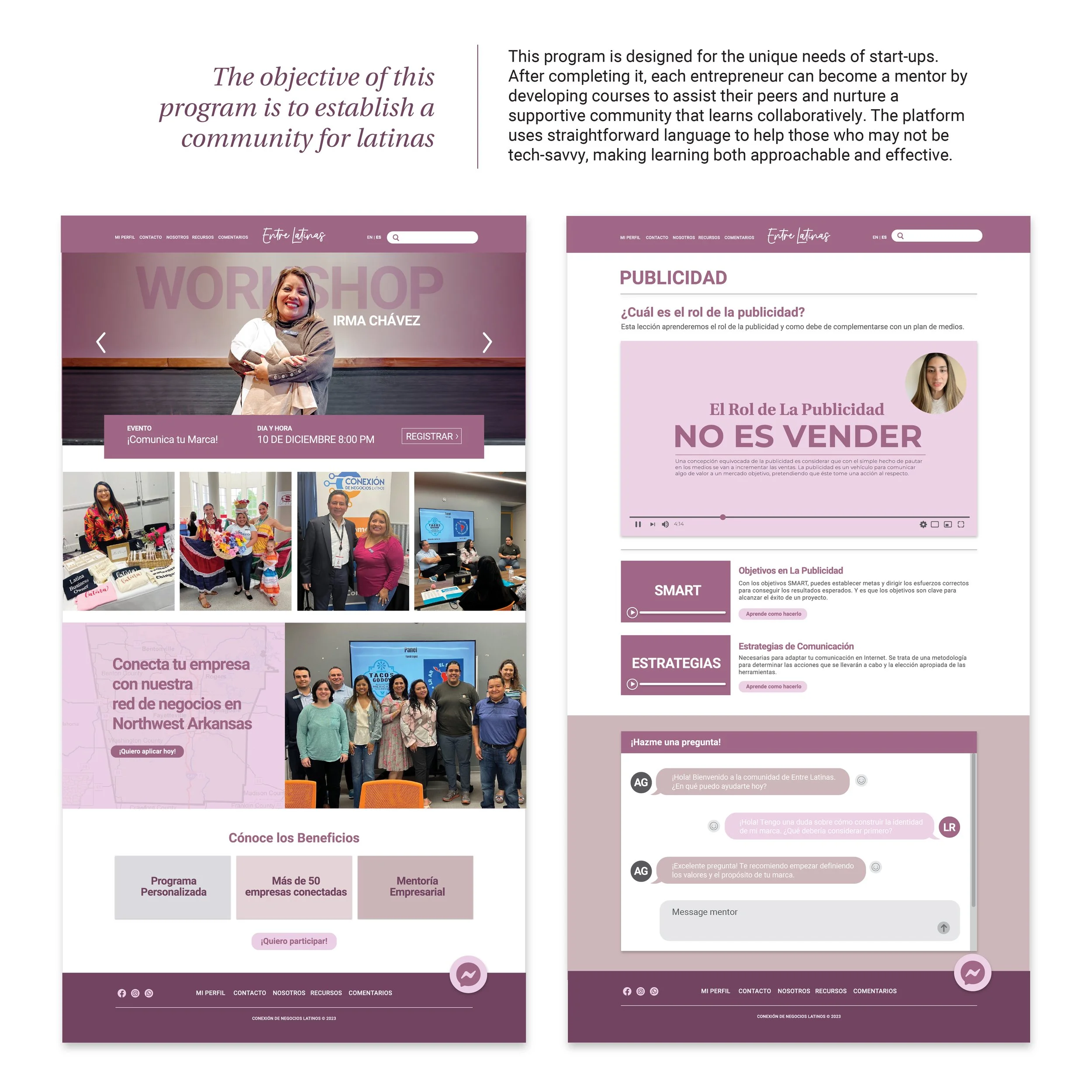 Entre Latinas is a responsive digital platform concept for Latina leaders and entrepreneurs in Northwest Arkansas. I led the research, UX/UI design, and prototyping of a bilingual learning and mentorship experience that combines events, self-paced education, and one-on-one support into a scalable community-centered system