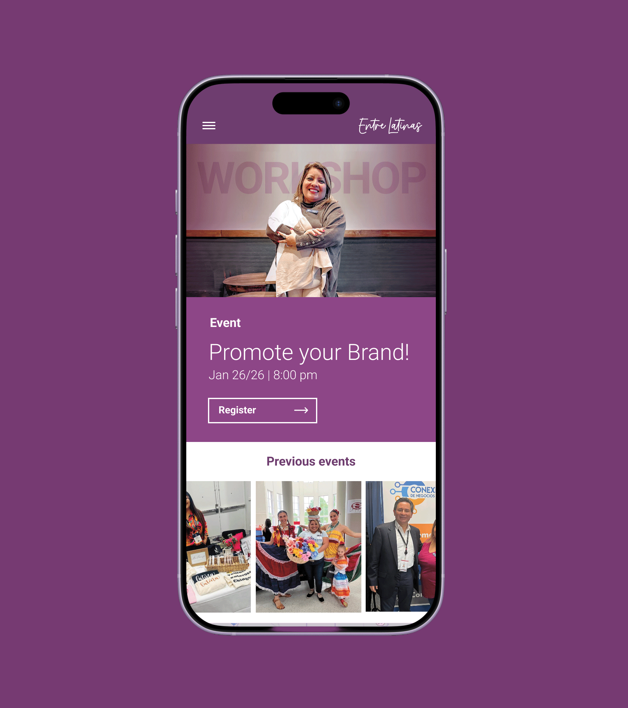 Most platforms lead with a sales pitch. Entre Latinas leads with events. That was a deliberate research-driven decision. Irma Chávez described how the Latino community doesn't trust institutions immediately. Trust is built in person, through shared experience and showing up. The home page reflects that reality. Before asking anyone to enroll in a course or commit to a program, the platform invites them to simply come to an event. Low barrier. High connection.
